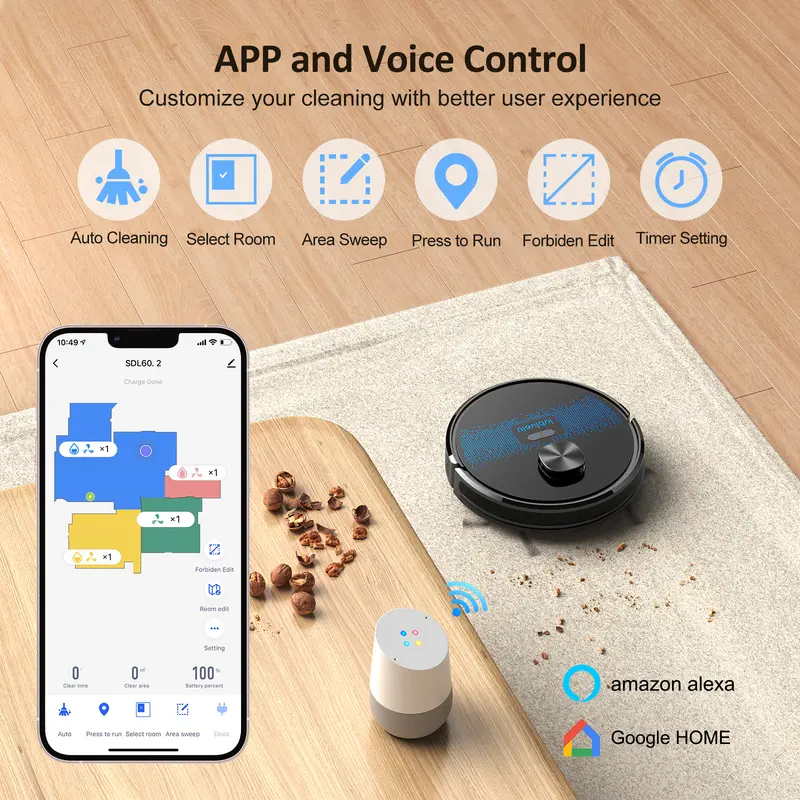 Fortschrittliche Lasernavigation mit systematischem Z-formigem Reinigungspfad für eine effiziente Hausreinigung Der SL6OD bietet dank seines fortschrittlichen SLAM-Algorithmus und der Laserentfernungserkennung mit 8 Metern Reichweite eine verbesserte Kartierungsgenauigkeit im Vergleich zu vielen herkommlichen LDS-Systemen. Es kann Wande, Mobel und Hindernisse in Ihrem Zuhause genau identifizieren, um eine prazisere Navigation zuermöglichen.